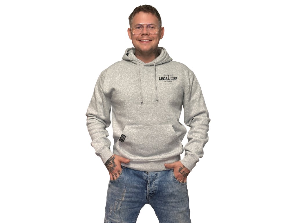 Kapuci zdobí štítek znázorňující logo Legal Life dvěma k sobě otočnými písmeny LL, dole na kapse je další větší štítek s logem a baseballovou pálkou, tyto vychytávky zvedají mikinu na jiný level, každý štítek je vyrobený a ručně našitý u nás v ČR stejně jako potisky. Mikina je velice kvalitní, při výběru textilu pro naší značku Legal Life jsme si dali velice záležet.