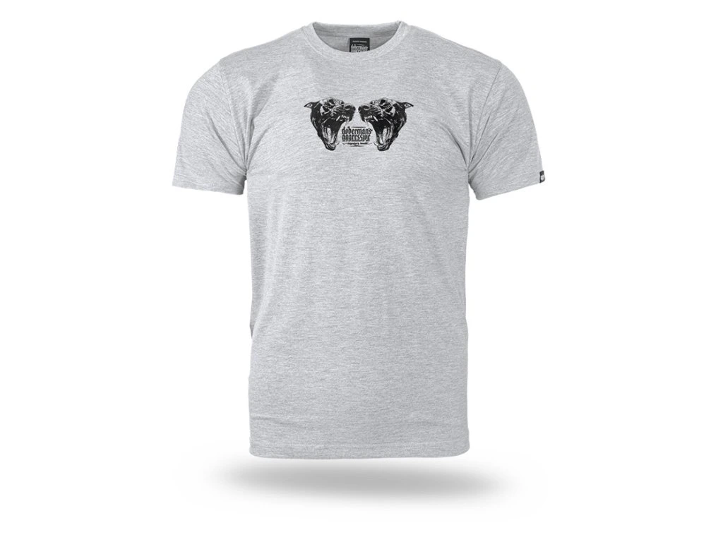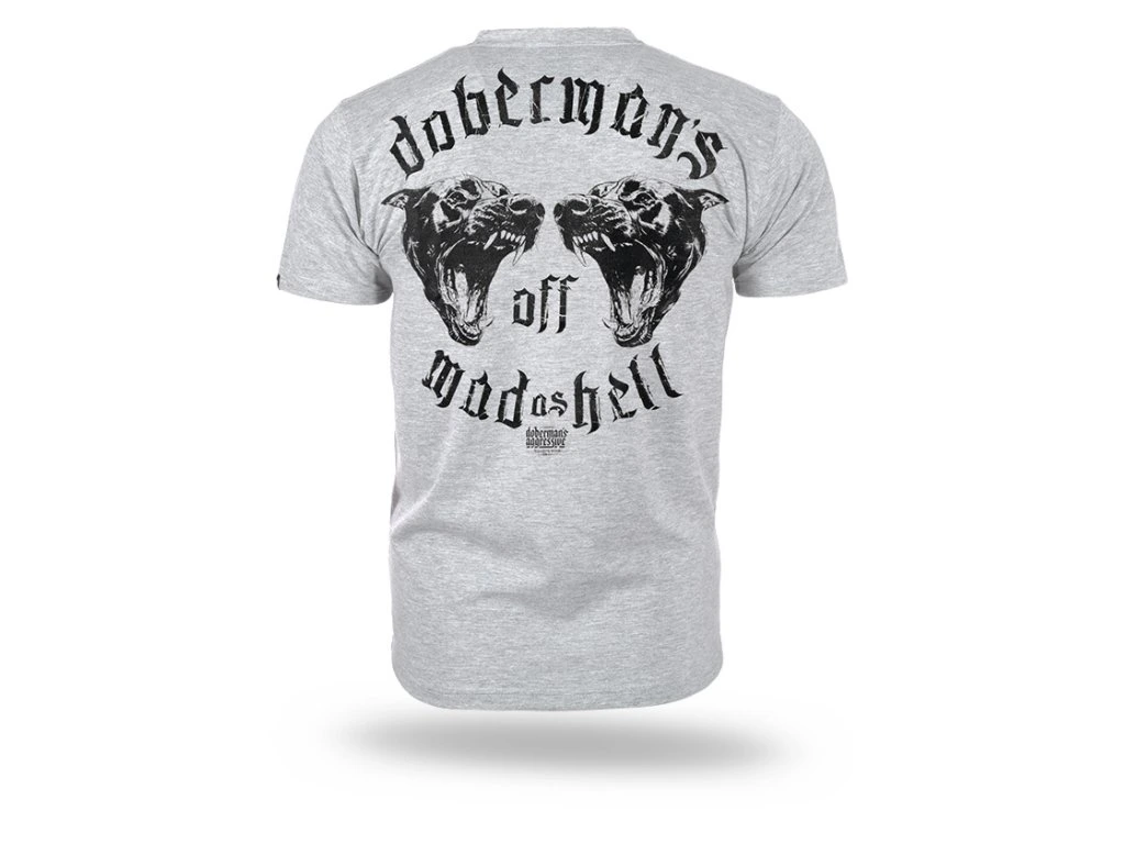 Model s výrazným potiskem na zádech, zobrazujícím dva rozzlobené dobrmany a sloganem "Dobrmani pryč šílení jako peklo". Na přední straně je menší potisk se stejným grafickým motivem.